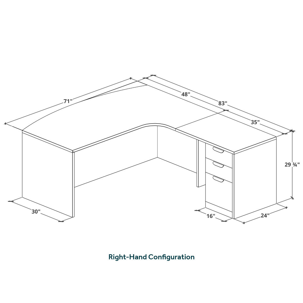 Classic L-Shape Bowfront Workstation 83" x 71" with Right Hand Return and Box/Box/File Pedestal - Espresso